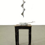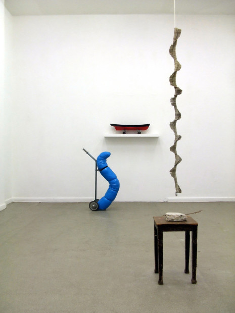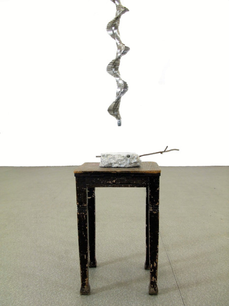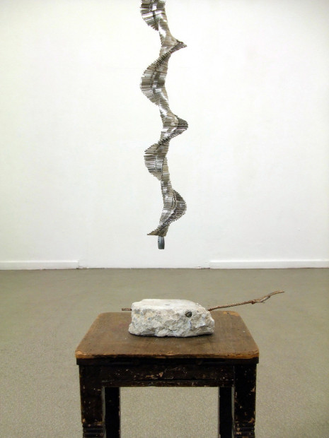 Material: Metallschlüssel, Drahtwäscheleine, Bausubstanzrest, Holzhocker