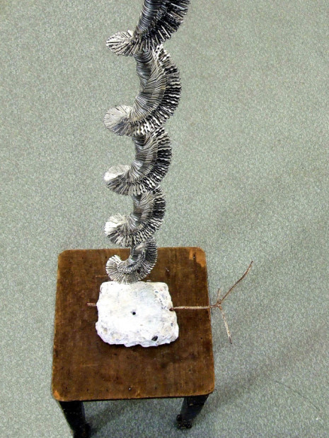Material: metal keys, wire clothesline, demolition rest, wooden chair